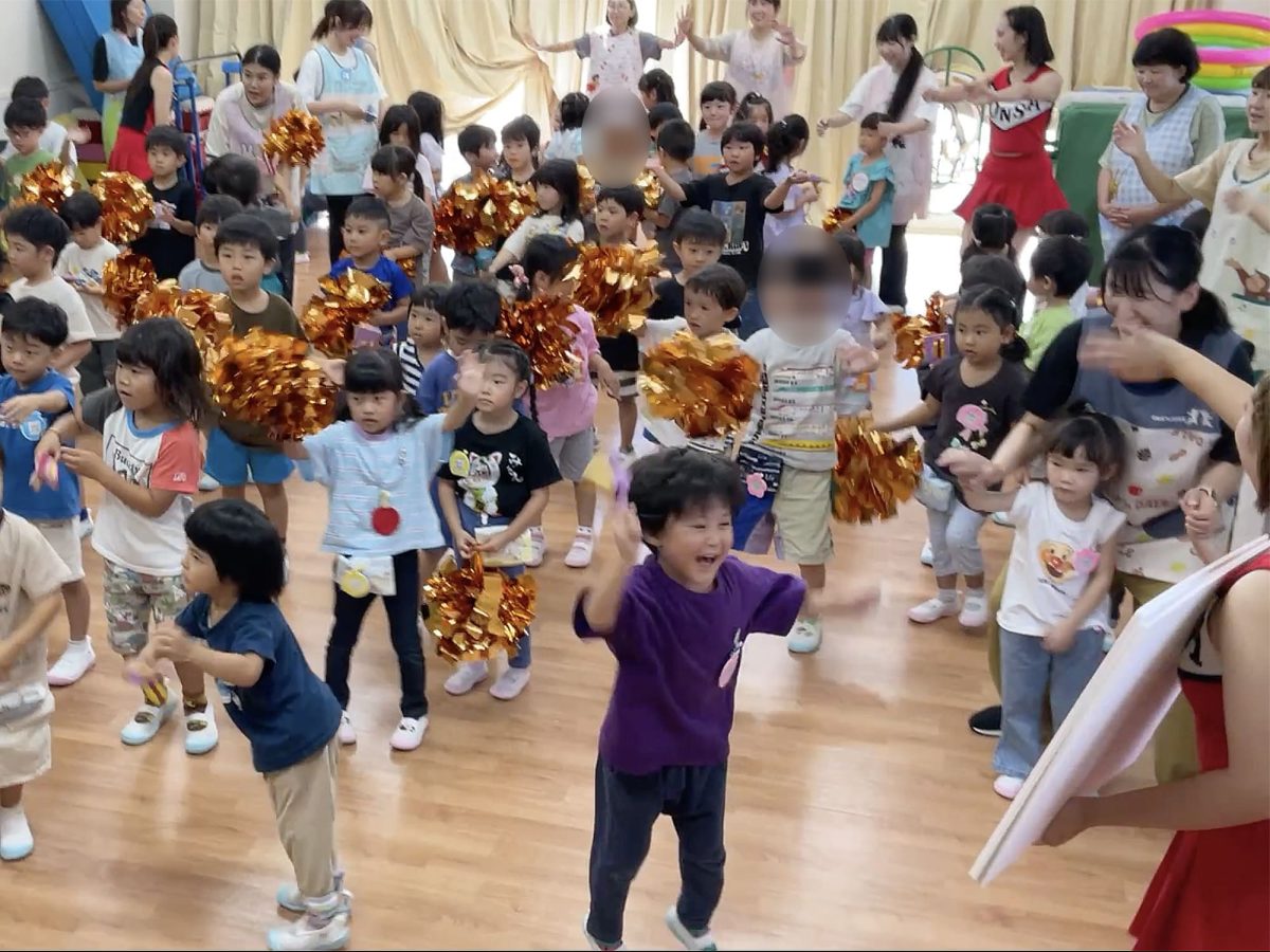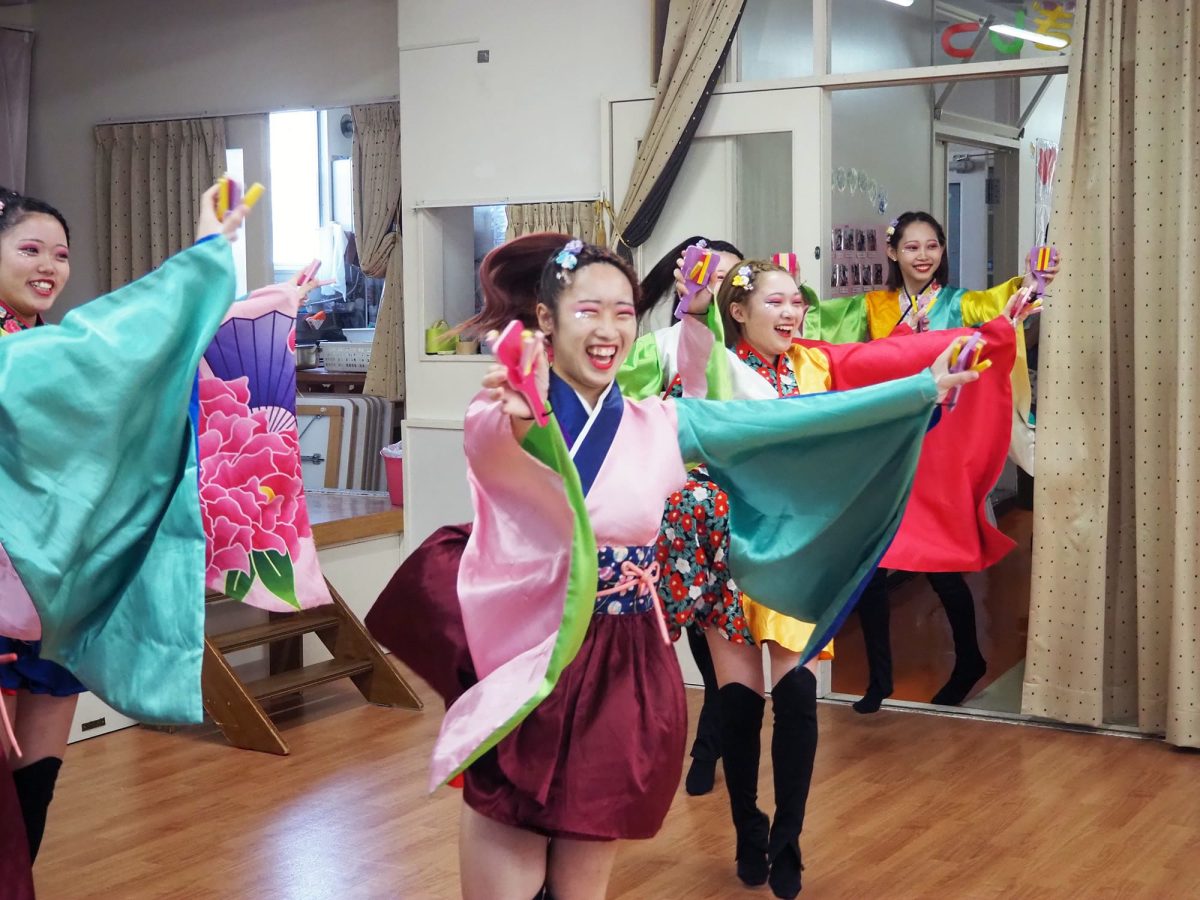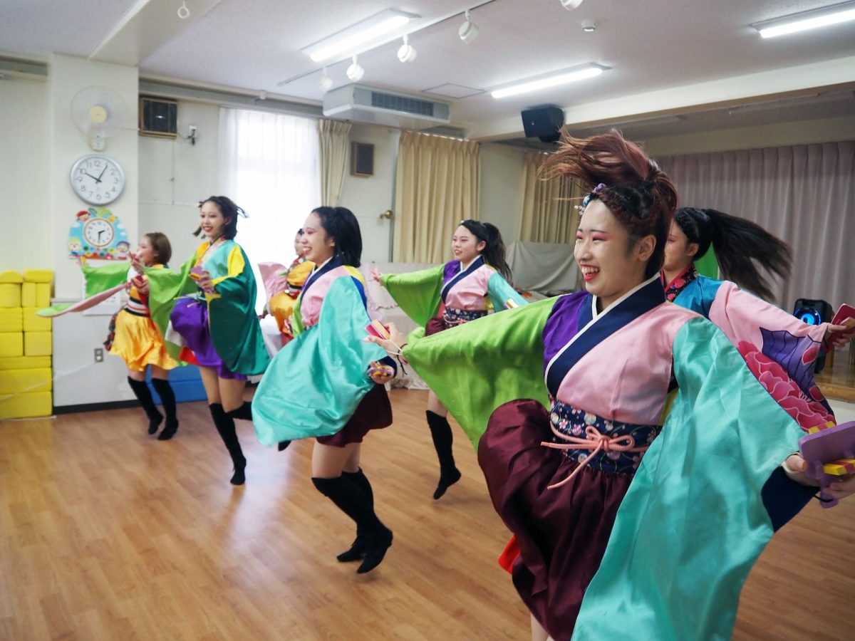 そして最後はメンバーが演舞の時に使っているポンポンや鳴子を園児のみなさんにも持ってもらい、覚えた振りを踊ってみました。園児のみなさんとともに先生方もノリノリで一緒に踊っていただくなど、会場が一体となりとてもたのしく踊ることができました!