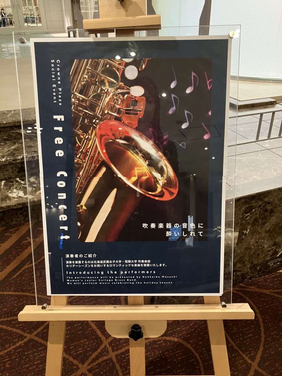 ホテルの冬季イベントの一環として出演依頼をいただき、クリスマスにちなんだ楽曲や、誰もが一度は耳にしたことのある映画音楽、ミュージカル音楽などを約1時間にわたりお届けしました。