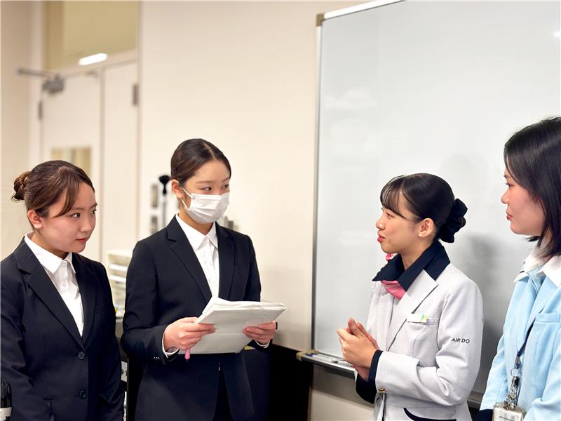 今回のセミナーでは、AIRDOの現役の客室乗務員、そしてグランドスタッフとして第一線で活躍されている、北海道武蔵女子短期大学の卒業生2名に御登壇いただきました。 会場には、これから就職活動を本格化させる北海道武蔵女子短期大学1年生の航空業界志望者が16名集まりました。