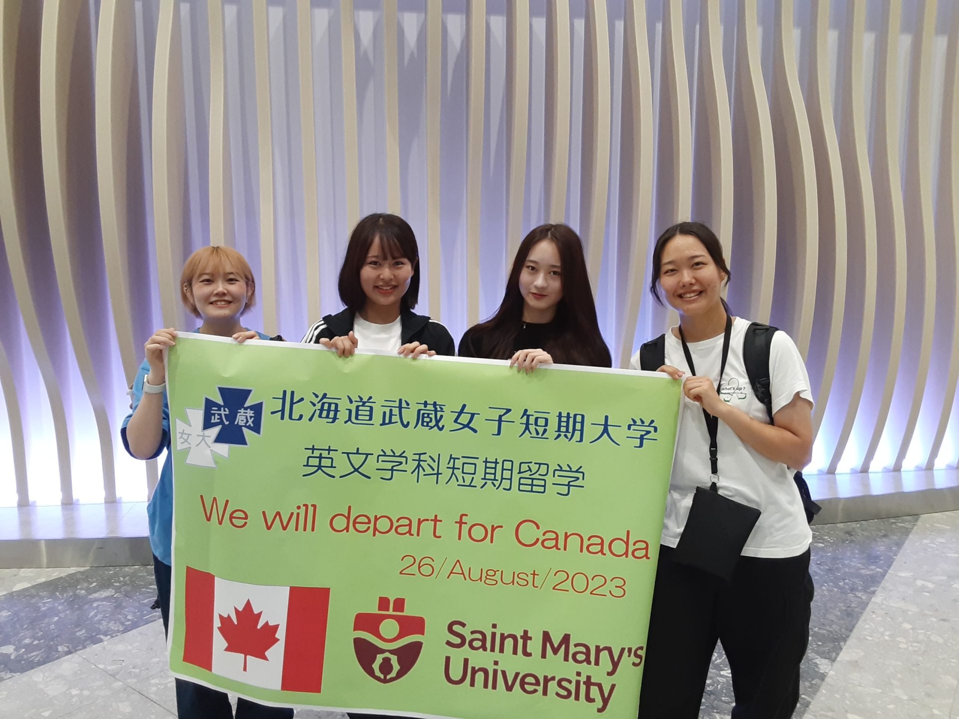 北海道武蔵女子短期大学 英文学科の1年生4名が、本学の「海外短期留学制度」を利用し、8月26日、新千歳空港からカナダ・ハリファクスへ元気に出発しました。