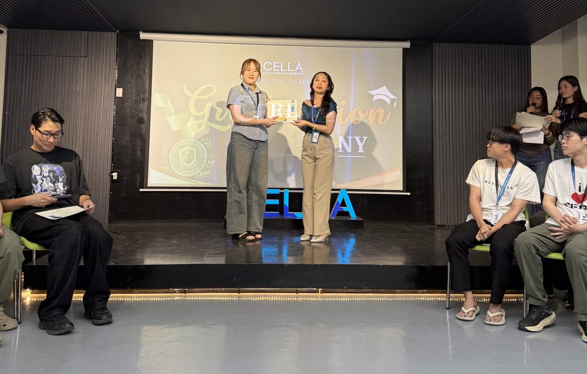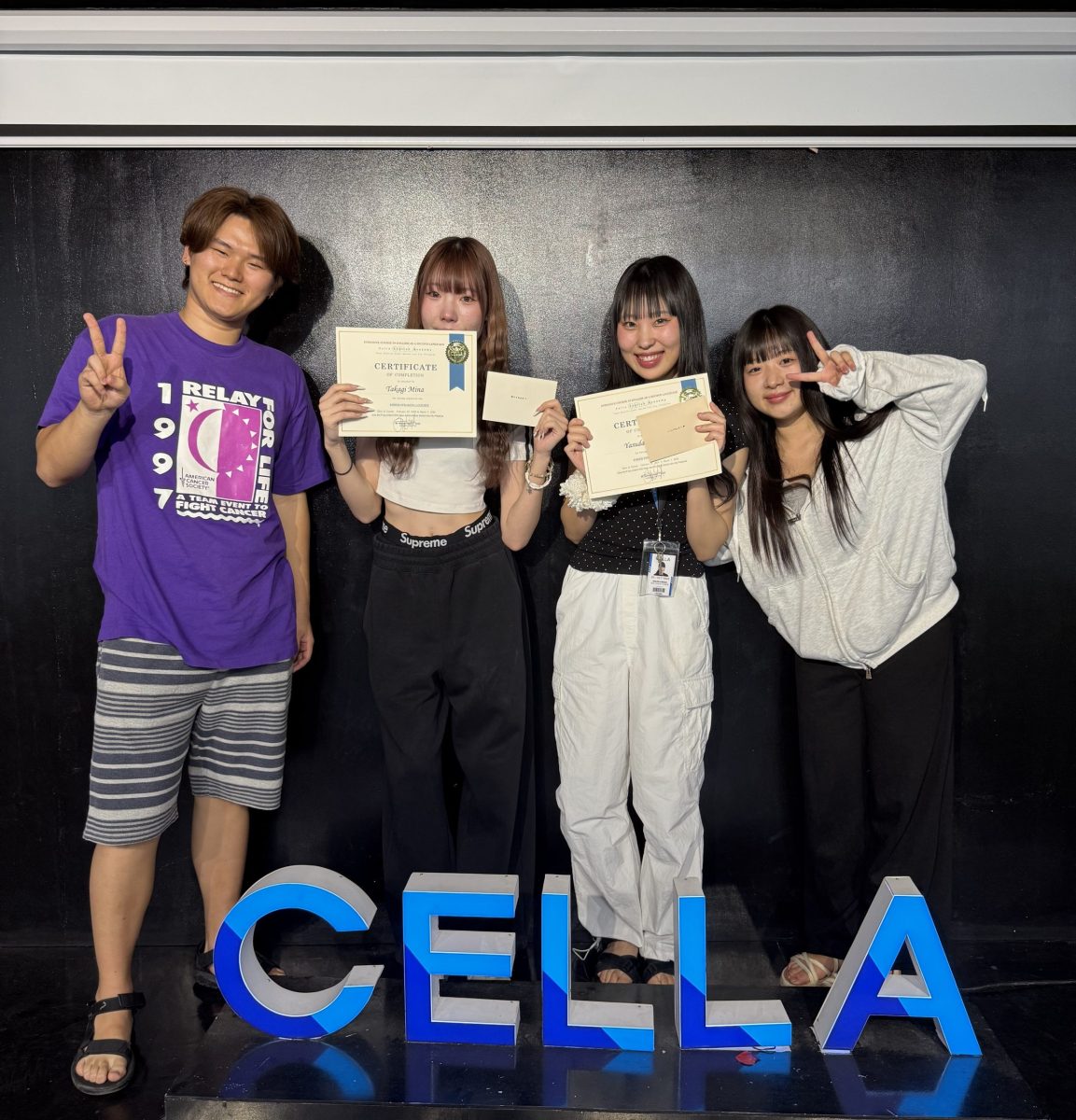 毎週金曜日の夕方、語学研修を終える学生たちがホールに集まり、修了書の授与式が行われます。会場には同じクラスで学んだ仲間だけでなく、まだ研修を続ける学生たちも駆けつけ、共に過ごした時間を振り返りながら旅立ちを祝います。