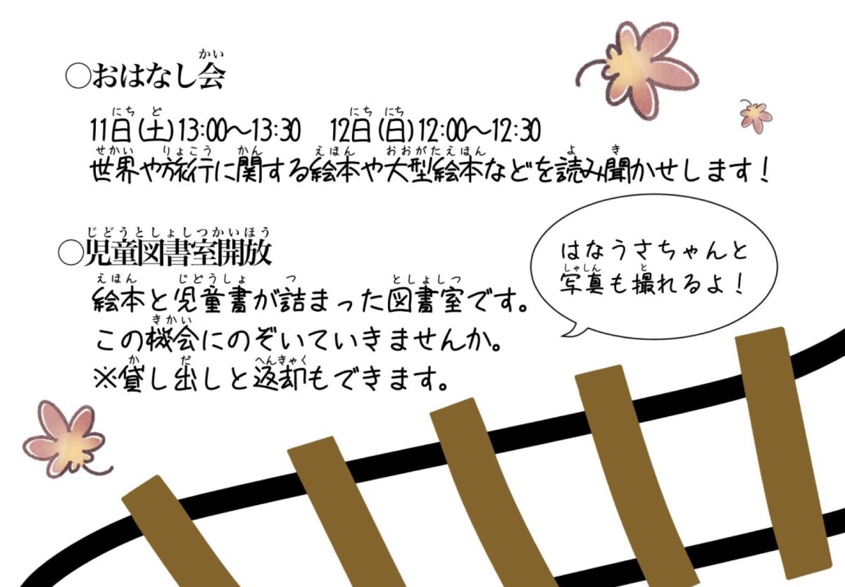 児童図書室の一般開放をはじめ、絵本の読み聞かせや可愛いフォトスポットなど、楽しい企画がいっぱいです。ぜひお気軽にお立ち寄りください。