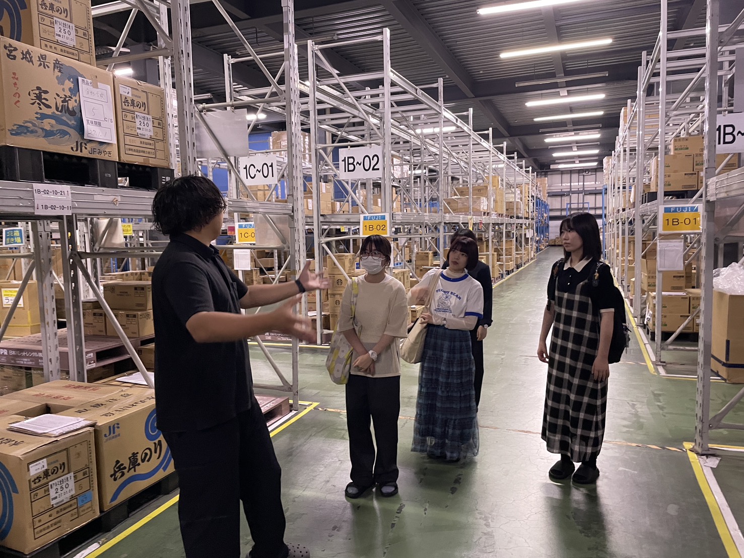 FUJIは食品卸の企業で、経営学部のPBL(Project Based Learning)科目「リーダーシップ応用演習」にご協力いただいた産学連携企業です。FUJIの広報に関する課題を担当したグループのメンバーと、大学祭の学生広報のメンバーとで、FUJIの事業内容や広報の狙いをお聞きするため、清田区の本社を訪ねました。訪問では物流倉庫も見学させていただきました。