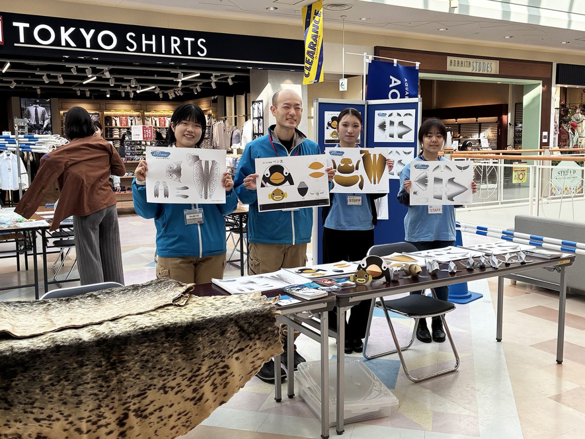KDPでは、いつもは水族館や動物園でペーパークラフトの工作をするワークショップをしていますが、今回はじめてのイオンショッピングモールでの出張ワークショップです。おたる水族館の飼育員の方たちと協力して、多くの子どもたちにアザラシの毛皮に触る体験とともに、ペーパークラフトの生き物の特徴や作り方となどのお話ししながら配布をしました。