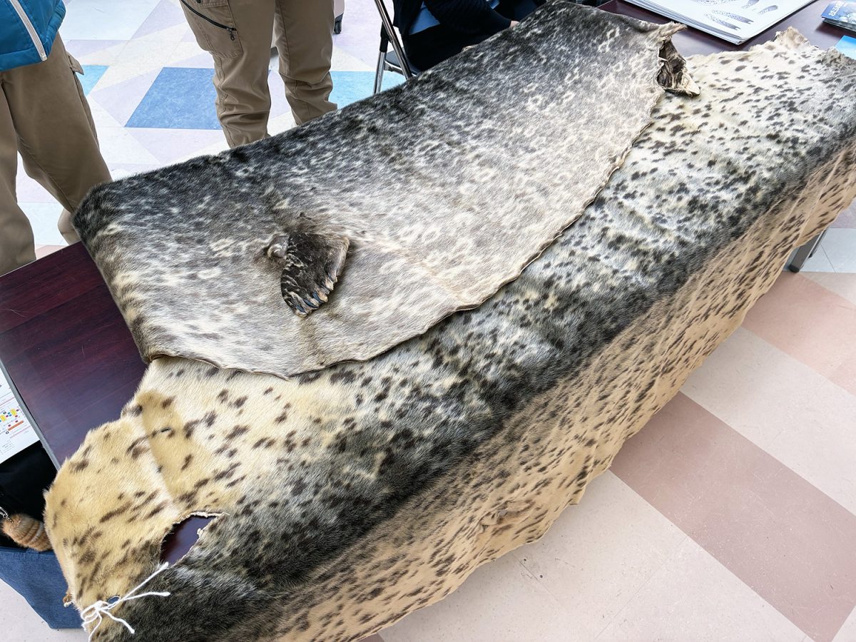 子どもたちは、はじめてさわるアザラシの毛皮にこわごわそっと触ってみていましたが、徐々に毛並みの手触りだけでなく前脚や後脚の形やそのするどい爪、捻れたヒゲなどを手で触ってみたりくわしく観察しながら大興奮です。事前に飼育員からアザラシの特徴やゴマフアザラシとゼニガタアザラシの違いやその毛皮の特徴などのレクチャーを受けた学生は、子どもたちといっしょに毛皮を触りながらいろいろなお話しをしていました。