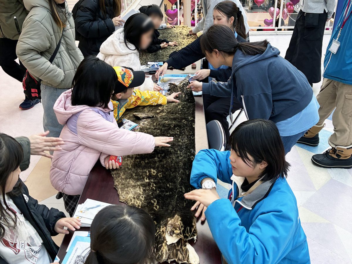 今回のイベントは札幌圏の自然系博物館、動物園、水族館、環境体験施設などをつなぐ活動を行っているCISE(ちせ)が企画したもので、北海道内のおたる水族館、札幌市円山動物園 など14団体の水族園や動物園、博物館が、それぞれの展示やワークショップ教材をもちより、多くの人たちが集まるショッピングモールのアトリウムで開催されました。KDPはおたる水族館のお手伝いとして9月に同館で開催したワークショップの時のペーパークラフトを配布と、ゴマフアザラシとゼニガタアザラシの本物の毛皮に触ってみる体験を子どもたちと楽しみました。