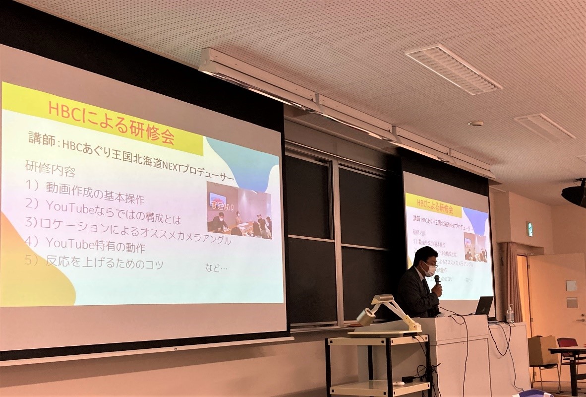 説明会では、JA北海道中央会の高橋様より「JAが行う農業支援の取り組み」や「学生と一緒に進めるコラボ企画の活動内容」について詳しくご紹介いただきました。後半には、昨年度から活動している2年生の武蔵生2名が、自身の体験談を発表。HBCでのアナウンサー研修や映像制作研修、実際の農場リポート、さらに撮影から編集・配信までを手掛けた経験を語り、参加者は学生主体の活動の楽しさとやりがいを肌で感じました。