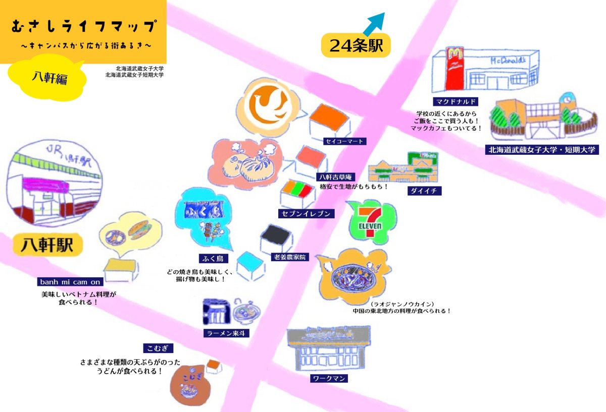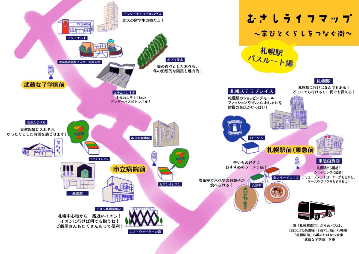 北海道武蔵女子大学から地下鉄南北線の北24条駅やJR八軒駅、さらに札幌駅周辺までの道のりがわかりやすく描かれており、大学の周辺にはどんな建物やお店があるのかを直感的に理解できるようになっています。初めて訪れる人でも、街の雰囲気や距離感をイメージしやすい構成です。