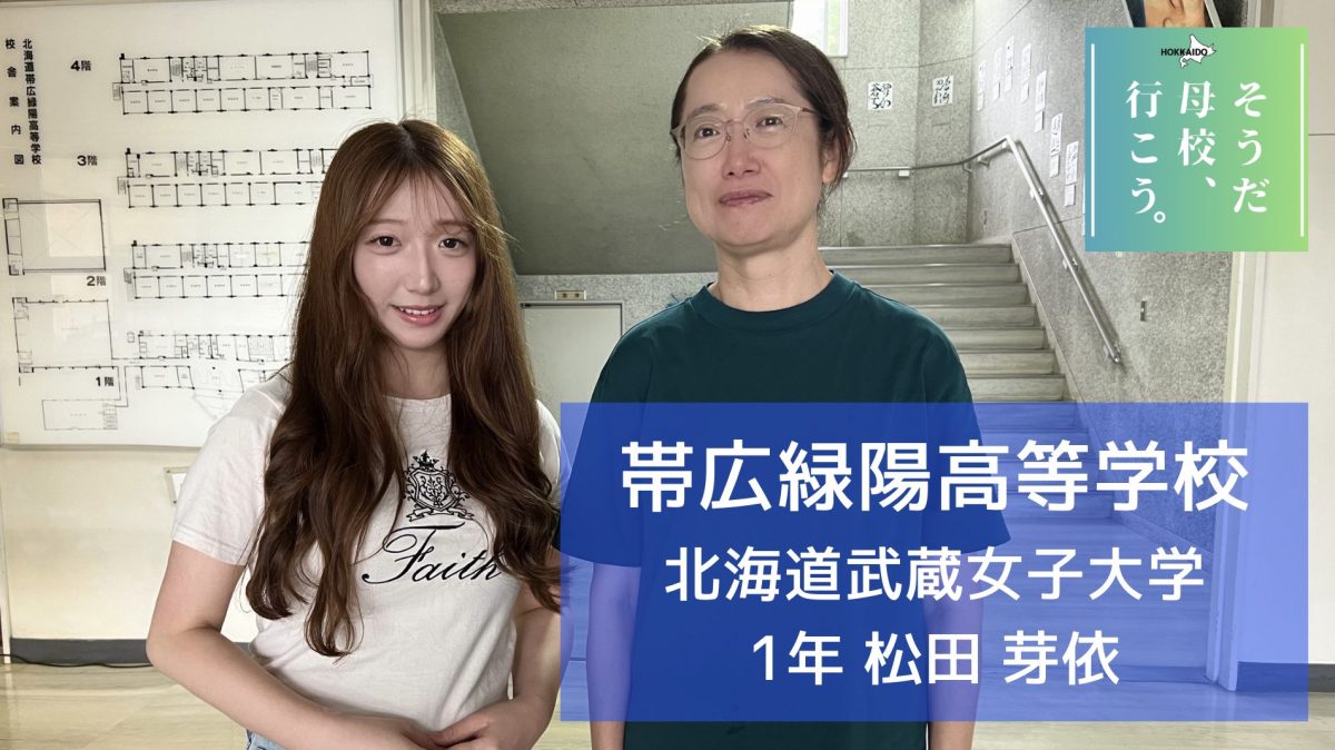北海道武蔵女子大学・短期大学では、高校時代にお世話になった先生に感謝の気持ちを伝え、進学後の成長を報告する取り組みとして「母校訪問プロジェクト」を実施しています。今回は、北海道武蔵女子大学に進学した松田芽依さんが母校・帯広緑緑高校を訪問し、担任の品田先生と再会した際の様子や感じたことをご紹介します。